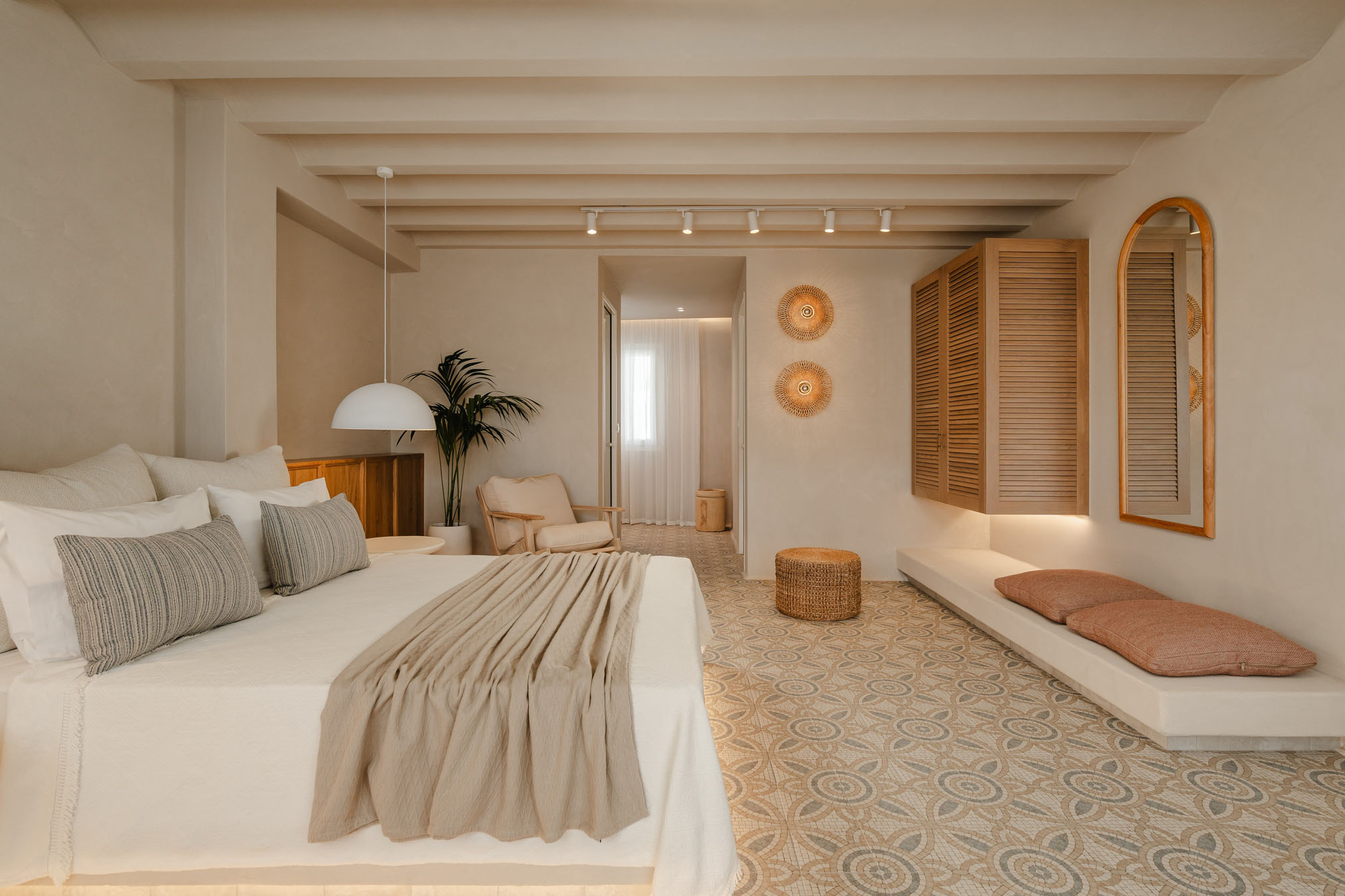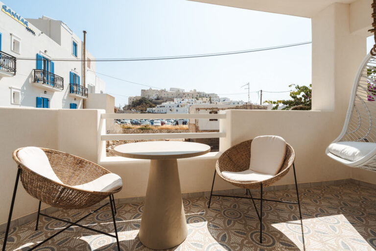 Castellum Suites is a small, family-run accommodation located in the heart of Naxos Town (Chora), combining comfort with Cycladic charm and offering views of the Venetian Castle. It is just 200 m from Grotta Beach, 600 m from the archaeological site of Portara, and only a 5-minute walk from the Archaeological Museum of Naxos.